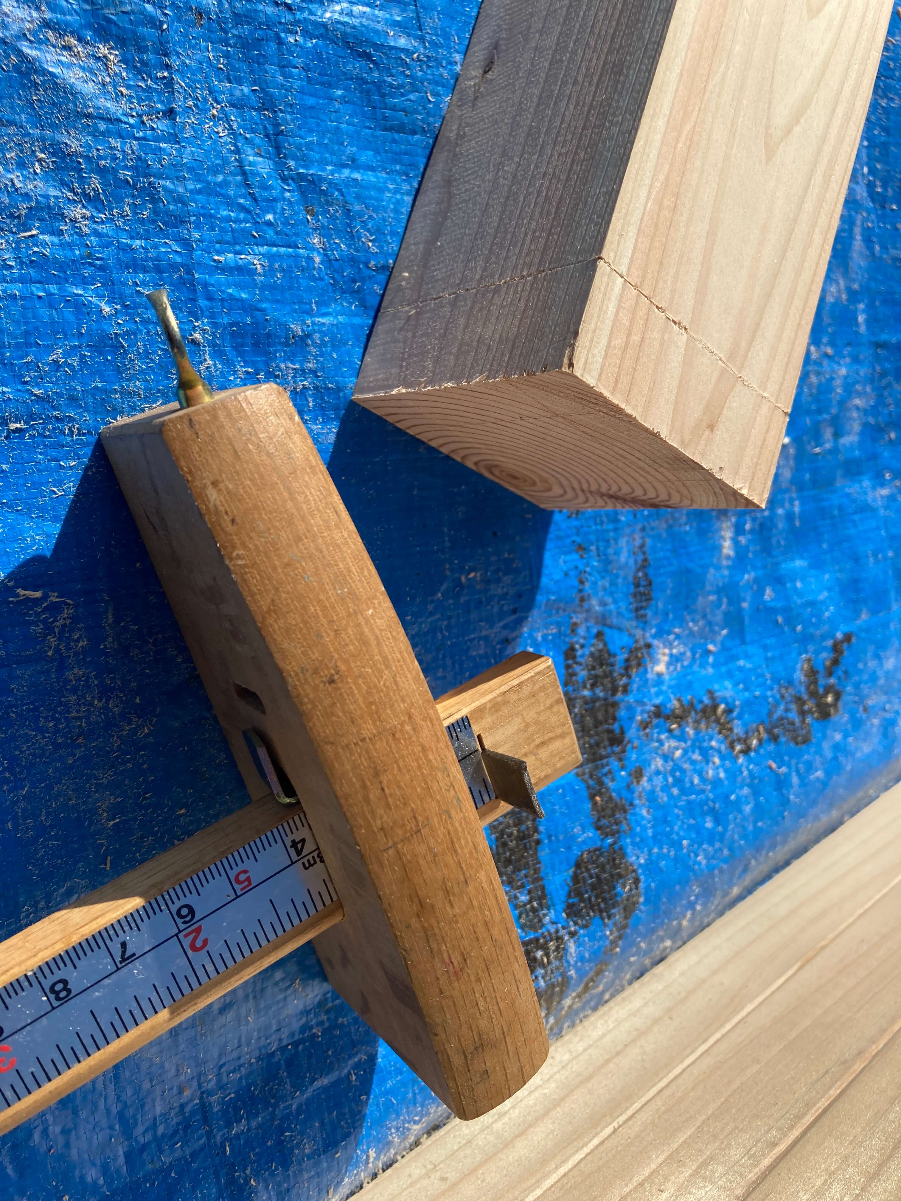 毛引きを使って加工する位置出しをします。加工の順番としては、ほぞを作ってからほぞ穴を加工します。正確に作ったとしても、ほんの少しずつ違いが出ます。ほぞを計測して、ほぞ穴を加工します。