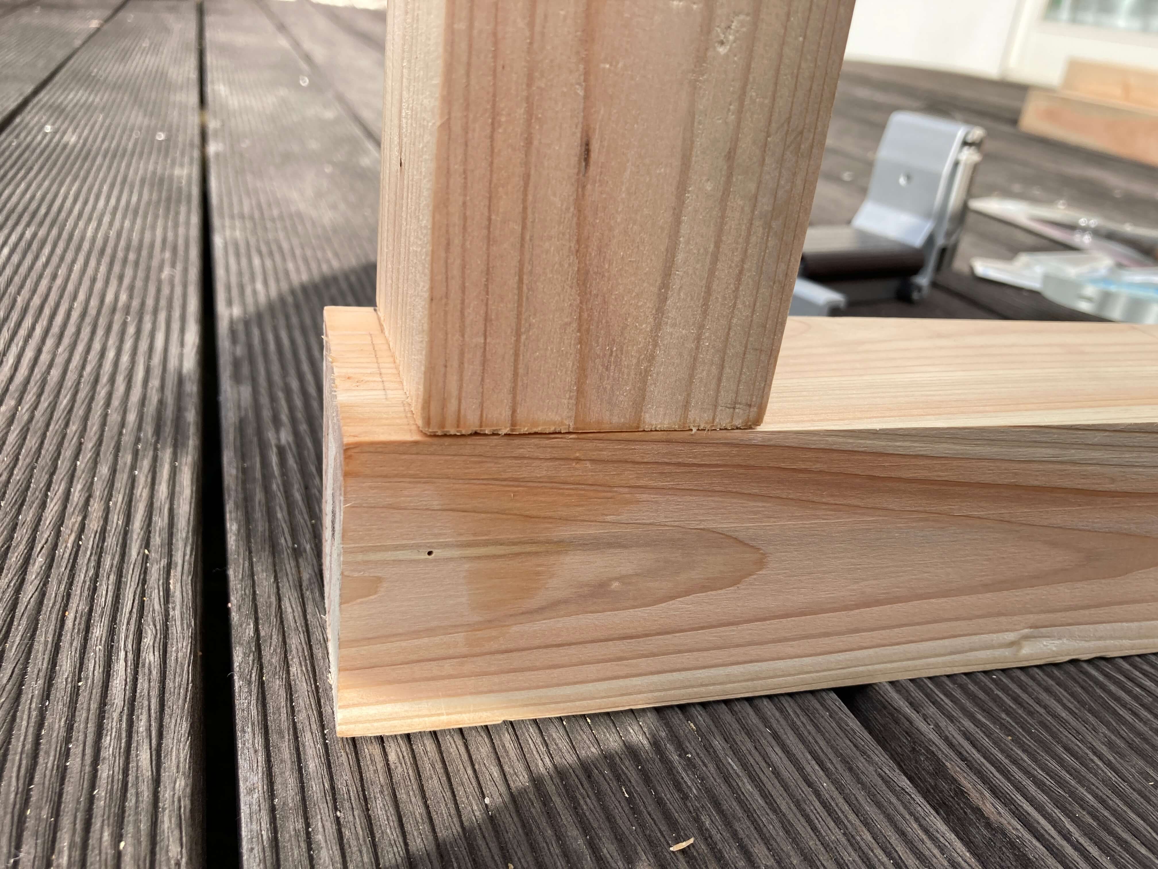 今回、ベンチの脚の部分には太めの角材を使用しました。その理由は、「ほぞ組み」の練習をしようと思ったからです。ほぞ組みとは、「ほぞ」を「ほぞ穴」を差し込んで固定する工法です。日本建築の在来工法では基本となるものです。